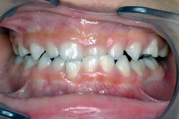 上の前歯が内側に生えています。お父さんも小さい頃に受け口の治療したとのことです。