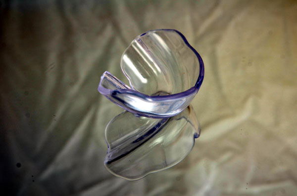 しょう(床)矯正装置を両手で上手にはめています。いい加減にはめたり、噛んで押し込もうとすると、針金が折れてしまいます。