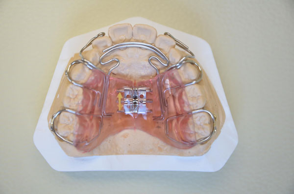 前歯をネジの力で押し出して、角度を変える取り外し式の装置に変更します。